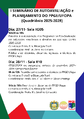 A Coordenação do Programa de Pós-Graduação em Educação (PPGE/Ufopa) tem a satisfação de convidá-los a participar do I Seminário de Autoavaliação e Planejamento do PPGE/Ufopa (Quadriênio 2025-2028), que ocorrerá nos dias 27 e 28 de novembro de 2025, conforme programação em anexo.