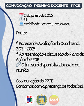 A Coordenação do Programa de Pós-graduação em Educação (PPGE/Ufopa) convoca os docentes do PPGE para a primeira reunião de 2026.