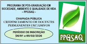 O Programa de Pós-Graduação em Sociedade, Ambiente e Qualidade de Vida (PPGSAQ) da Universidade Federal do Oeste do Pará, no uso de suas atribuições legais e regimentais, torna pública a abertura de inscrições para o Credenciamento de Docentes Permanentes Exclusivos para atuar no Programa durante o quadriênio de avaliação 2025-2028, conforme critérios de avaliação da CAPES e Regimento Interno do PPGSAQ.